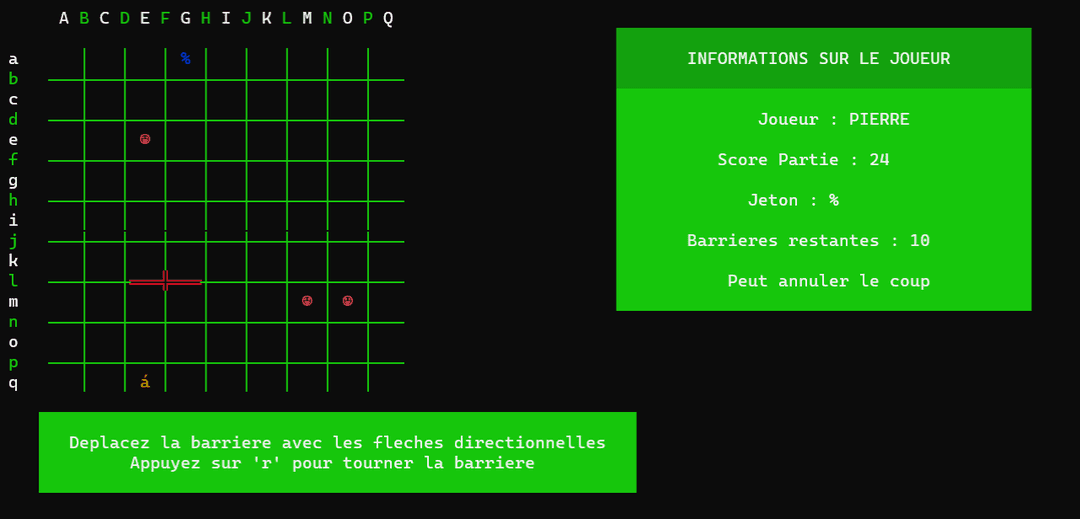 Ce projet consistait à créer une version en ligne de commande du jeu Quoridor en utilisant le langage C. Le jeu se déroulera dans le terminal, et nous utiliserons les fonctions de terminal pour créer une interface utilisateur graphique. Le jeu permettra à deux joueurs de s'affronter en utilisant des "murs" pour bloquer le passage de l'adversaire, mais il sera également possible de jouer seul contre une intelligence artificielle (IA) développée par nos soins. Nous avons implémenté une logique de jeu solide pour gérer les règles et les conditions de victoire, et nous avons également inclus des fonctionnalités telles que la sauvegarde et la reprise de partie.